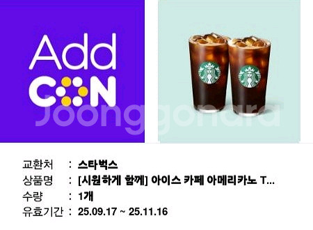 스타벅스 시원하게 함께 세트 (아이스 카페 아메리카노 2잔) 유효기한 : 2025. 11. 16 수량 : 1개 다른제품 교환 가능 사실하실 분은 채팅 주세요