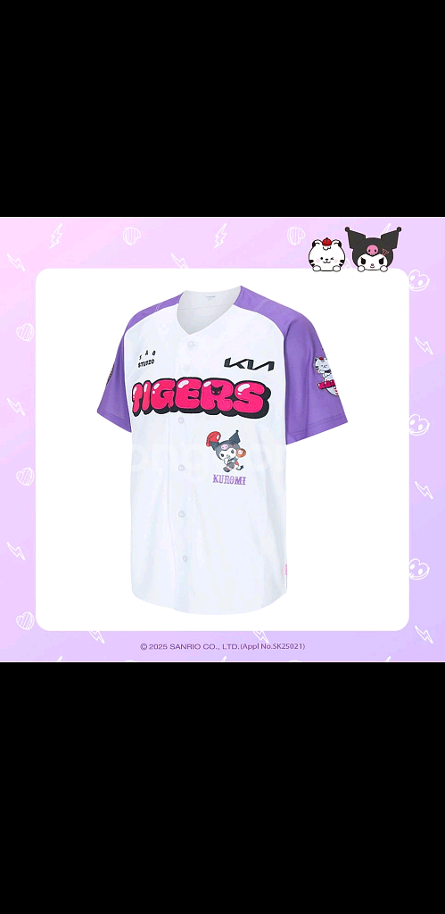 기아 타이거즈와 쿠로미 콜라보 유니폼입니다 흰색 바탕에 보라색 소매가 포인트예요 섹시투수 전상현 열마킹 입니다 사이즈 90사이즈 이고 오프라인으로 구매해서 바로 택배 보내드릴 수 있어요. 반택거래 일반택배거래 가능합니다. 의심되시는분 안심결제 하셔도되는데 대신 택배송장 보내드리면 구매확정 꼭 눌러주세요 안누르시는분 경험해서 진짜 그것도 스트레스라서요