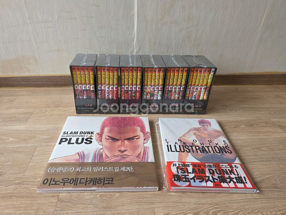슬램덩크 1권부터 31권까지 전권 박스 세트와 함께, 슬램덩크 일러스트집 PLUS, 그리고 이노우에 다케히코 ILLUSTRATIONS 일러스트집까지 총 2권이 포함된 구성입니다 모든 책은 비닐 포장된 미개봉 상태로 보이며, 소장 가치가 매우 높습니다 슬램덩크 팬이라면 놓칠 수 없는 완벽한 세트입니다