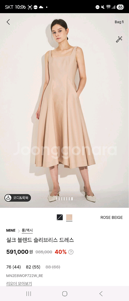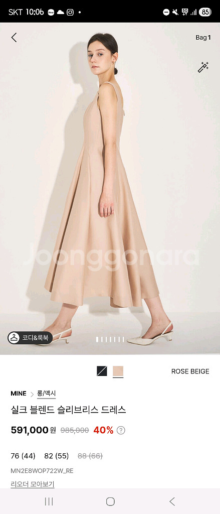 MINE 실크 블렌드 슬리브리스 드레스 로즈 베이지 색상입니다. 사이즈는 82이고, 스타일 번호는 MN2E8WOP722W입니다. 정가는 985,000원입니다 현재 한섬몰에서 59만원에 판매합니다 저는 작년에 백화점에서 구매했고 사이즈가안맞아서 입어보지도 못하고 갖고있다가 더예쁘게입어주실분께 보내려고 내놓아요 가격네고없이 쿨거래하실분만 연락주세요 좋은분과 거래원합니다 개인간의 거래이니 환불 불가한점 양해부탁드립니다