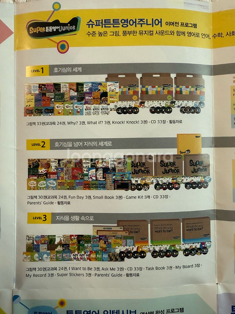 규리펜 포함 슈퍼튼튼영어주니어 풀세트 입니다. 각 레벨별 사용한 워크북은 제외하고 전구성 다 있습니다. 부모 가이드가 다 있고 규리펜으로 터치하며 학습할 수 있어서 아이와 함께 재미나게 영어학습 가능합니다. 부피가 있어 직거래 가능하고 서울 및 경기권 저녁에 최대한 맞춰 갖다드리도록 하겠습니다.