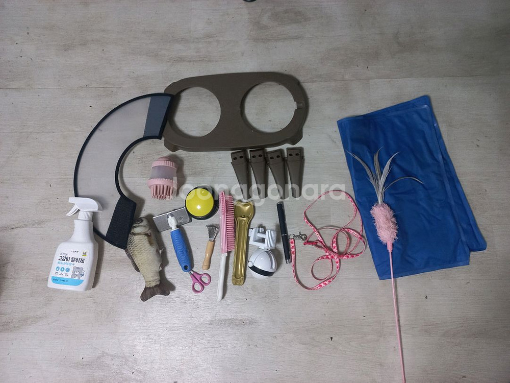 고양이 키우시는 분들께 필요한 용품들 일괄 판매합니다~ - 털 브러쉬, 발톱깎이, 장난감, 넥카라, 쿨매트, 식기 거치대,츄르짜개수저,샤워브러쉬,간식훈련버져,고양이탈취제,넥카라5호2개(1개는 미사용새것) - 상태는 사진과 같습니다 사용감있어요 털붙어있을수있어요