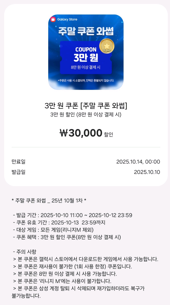 개인정보(거래정보)를 주고받는 행위는 사기에 노출될 수 있으므로 즉시 중고나라로 신고해 주세요겔럭시스토어 30000만원 할인 쿠폰 팝니다. (최소 결제 80000원) ㅡ가격 15000원 @입금전 해당 게임 알려주시면 됩니다.@ (ex.) 80000원 아이템 결제시, 65000원 입금후, 진행.