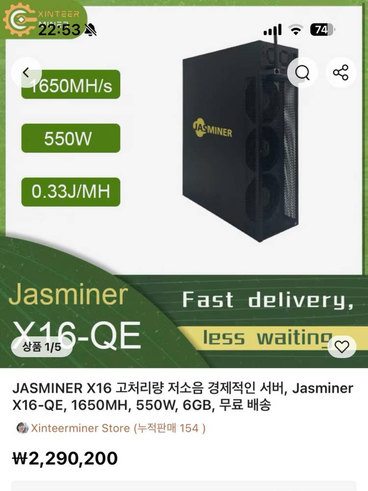 JASMiner - X 16qe 1650MHz 채굴속도 550W 전력으로 성능이 우수해요. 상태 양호하고 정상 작동 확인했습니다. 구매 일자 2024년08월 21일 (알리익스프레스) 구성품 풀박스