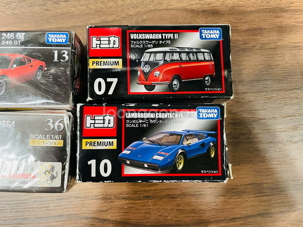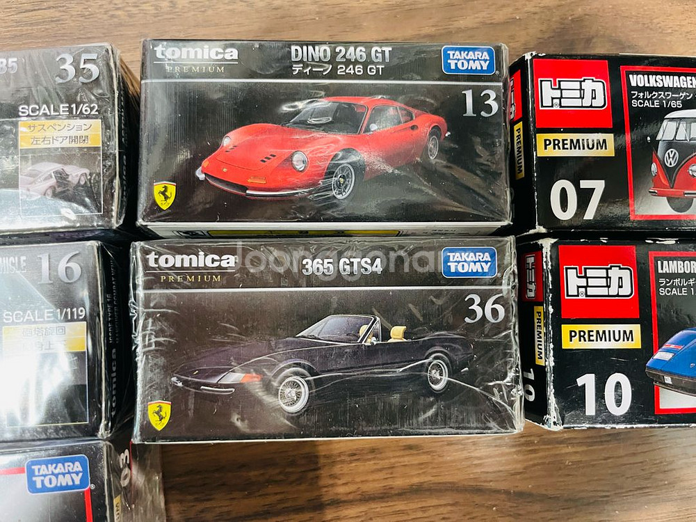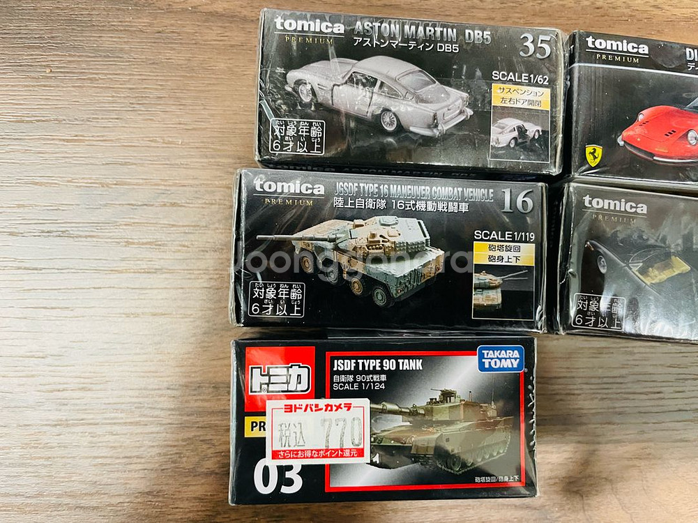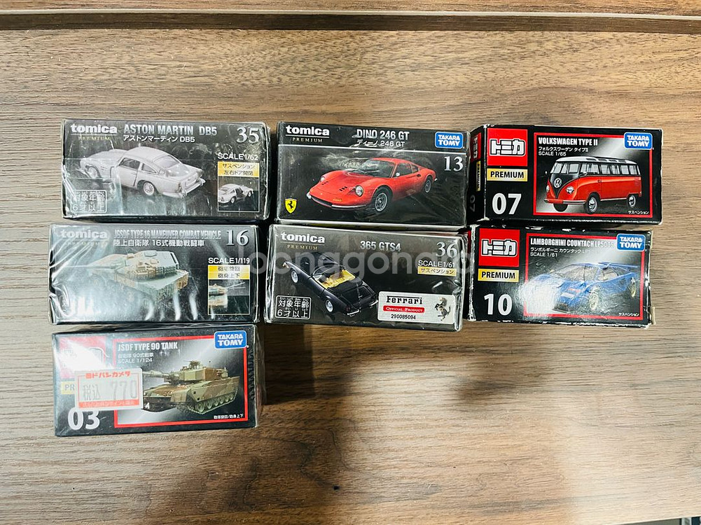 토미카 프리미엄 시리즈입니다. 폭스바겐, 람보르기니만 전시품이고 나머지는 뜯지 않은 새제품입니다. 일괄하시면 큰 디스카운트있습니다. 1. 애스톤마틴 : 3.5만 2. 탱크 타입 16 : 2.5만 3. 탱크 타입 90 : 2.5만 4. 페라리 디노 : 3만 5. 페라리 365 gts4 :4만 6. 폭스바겐 타입2 : 3만 (전시용 중고) 7. 람보르기니 쿤타치 : 전시용 중고이나 살때부터 왼쪽에 작은 기스입니다(사진확인) : 3만