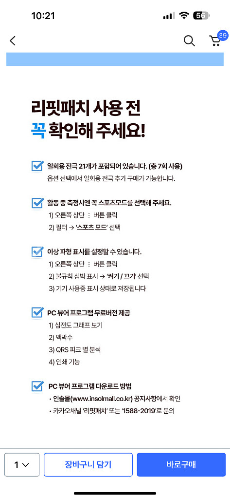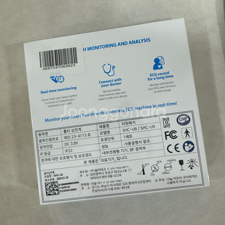병원에서도 쓰는 심전도 측정기입니다 보통 심장이상 생겨서 진료예약하고 병원가거나 응급실 가면 이상없다고 하는게 대부분이에요 갑자기 발생한 부정맥같은 증상들은 지속되지가 않아서 잡기가 힘든데 이런 홀터 붙이고 있으면 더 쉽게 잡을수가 있죠!! 패치도 여러개 있어서 패치만 바꿔주면 지속 사용 가능합니다 비닐포장도 뜯지않은 새거입니다