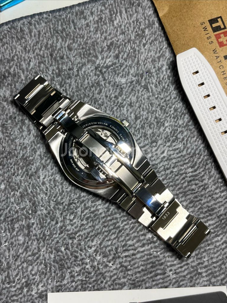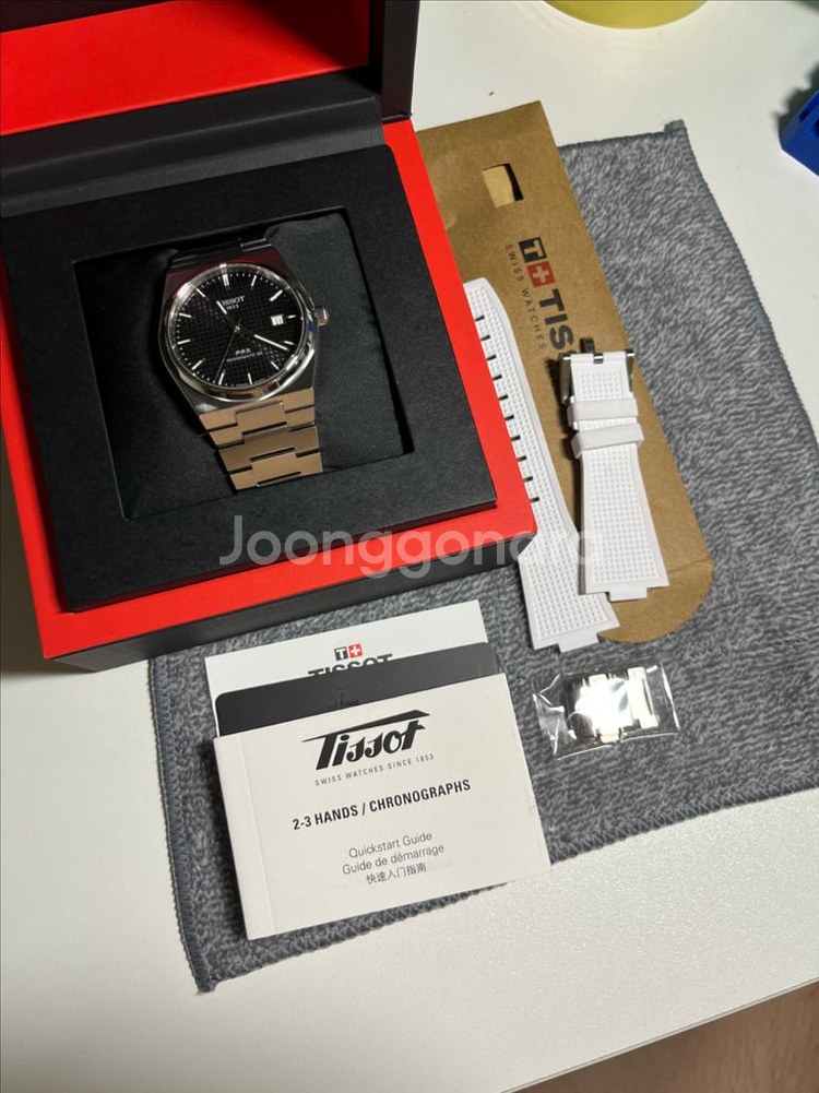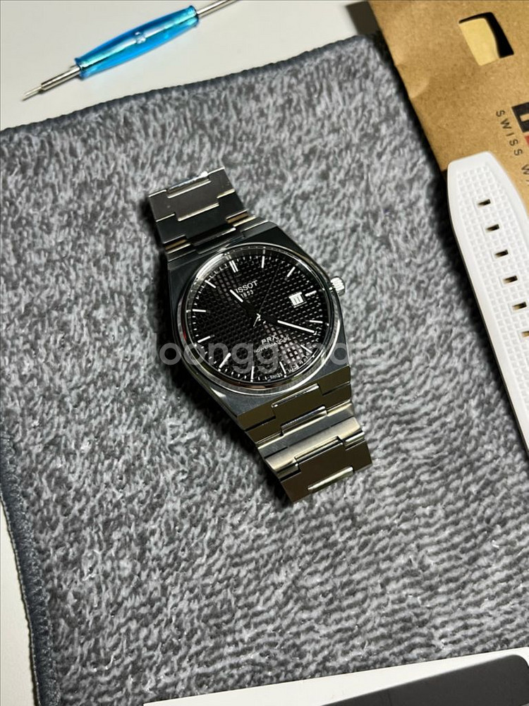 티쏘 prx 오토매틱 (파워매틱 80) 40mm 입니다 구매 당시 모든 구성과 흰색 러버스트랩까지 포함입니다. (2025 8월 구매) 실착용 5회 이하로 아주 미세한 잔기스 제외하면 눈에 띄는 부분은 없습니다 직거래는 동탄, 서울대 입구, 서울 삼성동 에서 가능합니다