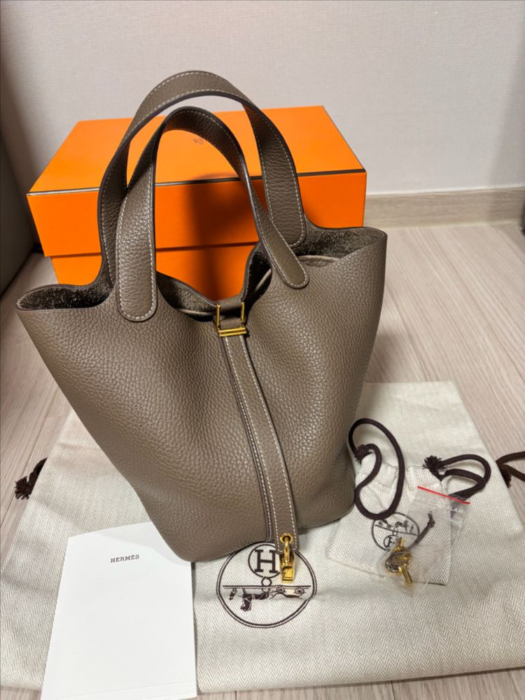 21년도 구매한 피코탄 에토프 금장 y각인 입니다 백화점 구매이고 종이가방 빼고 인보이스, 전자영수증 등 구성품 모두 있습니다. 귀한 에토프 금장이고 각 무너짐 없고 자물쇠쪽 생활기스, 바닥면 모서리 상태 확인해주세요 평소 스타일이랑 어울리지 않아서 몇번 착용은 안했지만 중고인점 감안해주세요 지금도 팔지말지 고민하다가 내놓는거라서 에눌 문의는 받지 않겠습니다 제가 지방에 거주하는 관계로 택배거래만 가능할 거 같고 안전거래 가능합니다 시몰가 이너백 같이 드려요