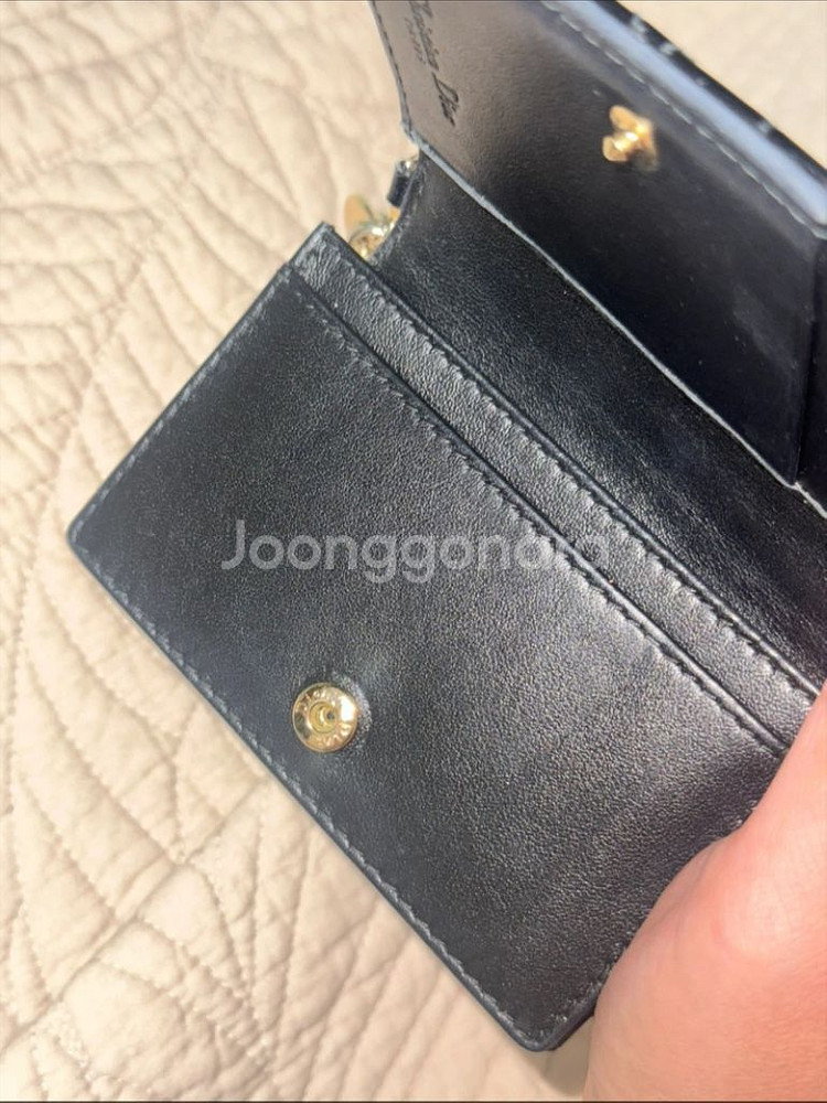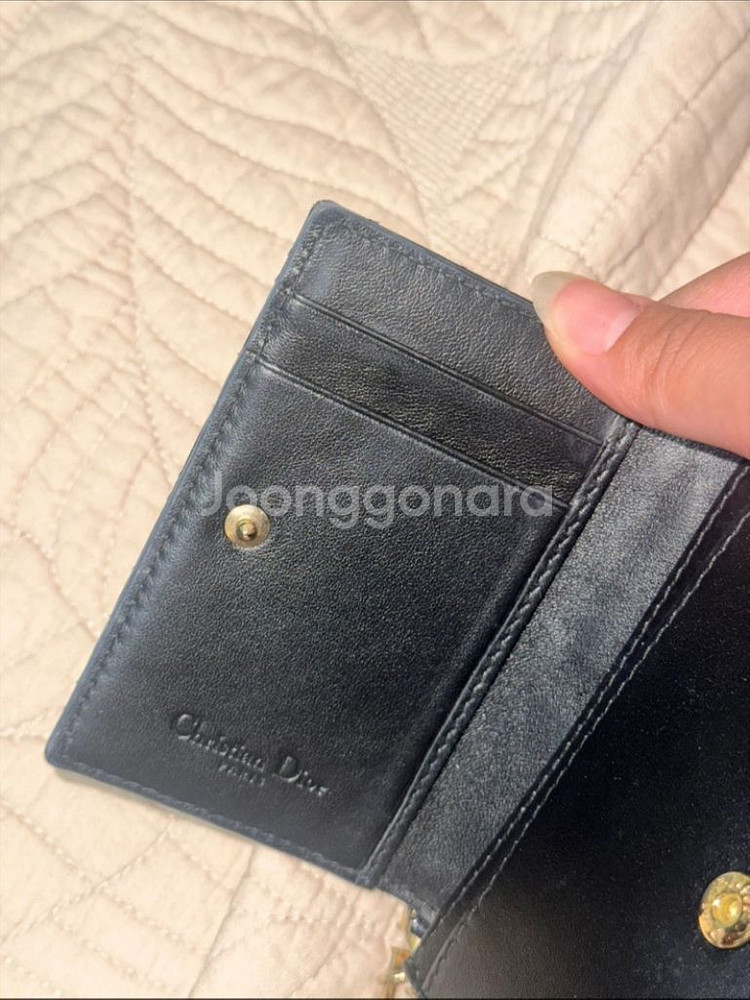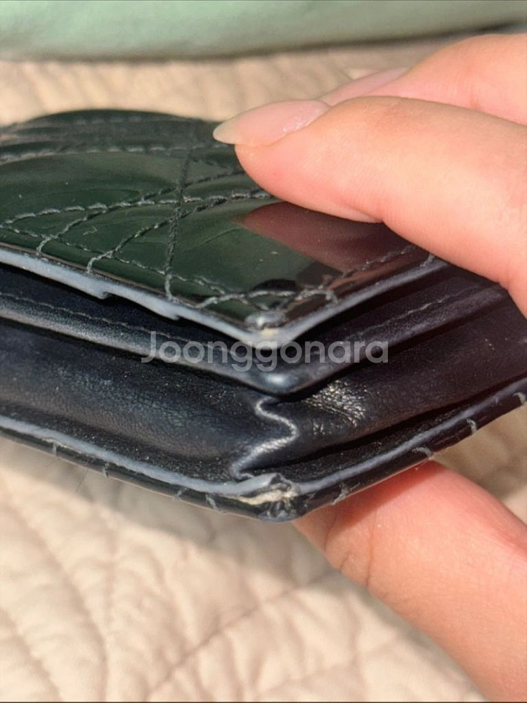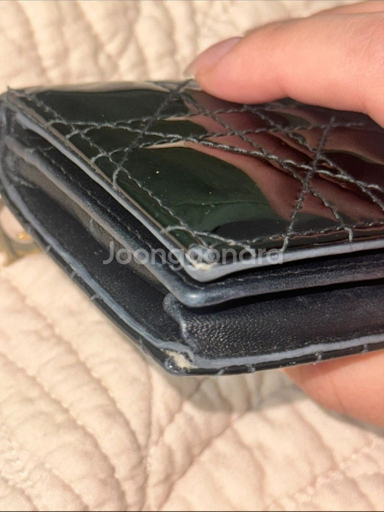 23년 10월구매입니다. 디올 레이디 디올 블룸 카드 지갑입니다. 블랙 페이던트 까나쥬 송아지 가죽 소재입니다. 사용감으로 인한 모서리 마모가 있습니다 얼룩이 지지 않는 가죽이라 오래 사용해도 새거 같아요. 안쪽 가죽은 눌림이나 스크래치, 오염 없습니다 쇼핑백, 박스(리본 그대로 묶여있고 안에 더스트백?같은 담는것도 있어요) 풀구성입니다