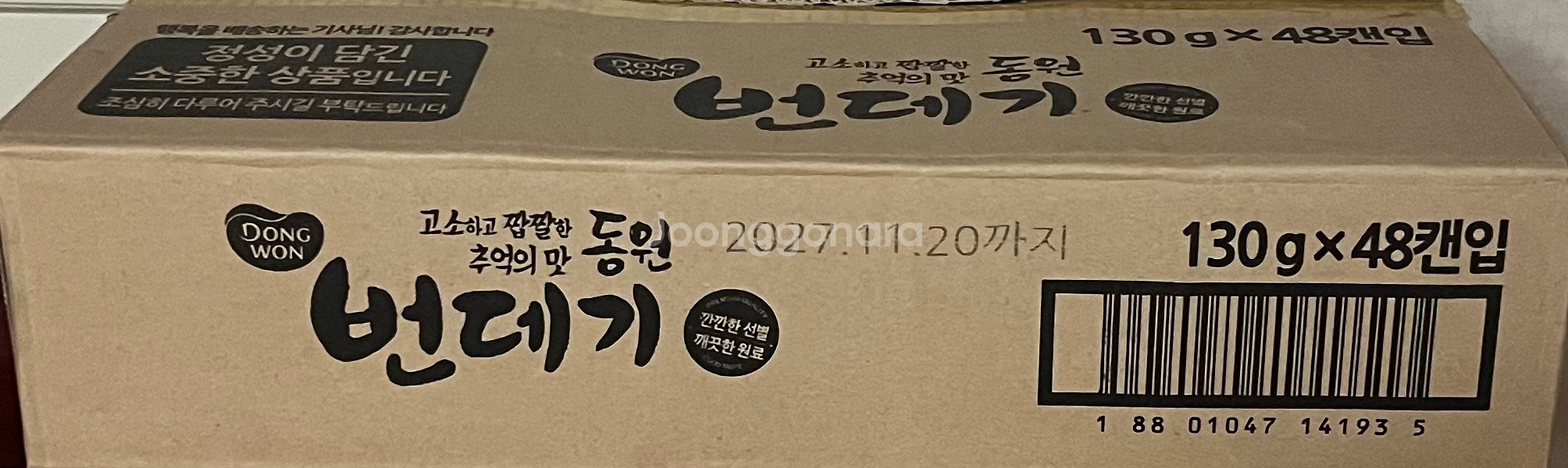 무료배송) 동원 번데기 캔 통조림 130g 48캔 1박스 금액:45000 유통기한: 27.11.20 재고 : 1박스 낱개 구매 안됩니다 !!! 택배는 당일 오후3시30분 이전 입금시 당일17시30분이전 발송 3시30분이후 입금 다음날 발송되니 참고해주세요 우체국 등기 익일배송 주말택배x