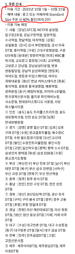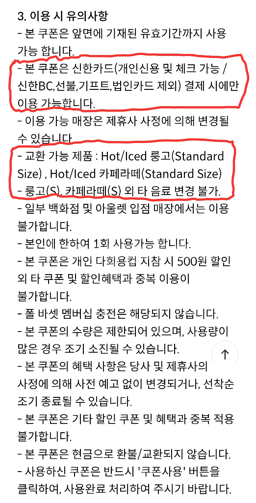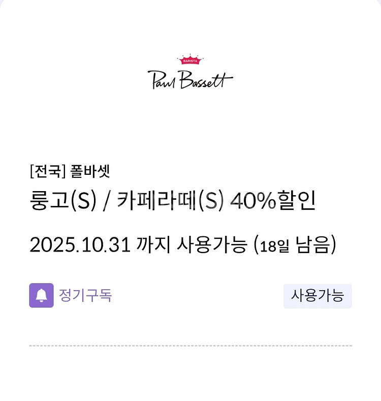 2잔까지 가능한 신한카드 전용 폴바셋 40% 할인쿠폰 롱고, 카페라떼 (S) 신한카드 결제 전용입니다 1장 (2잔가능) 700원 사용기한 ~10월31일까지 유의사항 참고해주세요 안심번호로 문자주시거나 채팅주세요