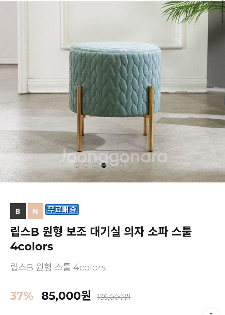•사이즈: 450x450x450mm(가로x세로x높이) 립스B에서 나온 고급스러운 원형 스툴입니다. 은은한 민트 색상에 금색 다리가 포인트로, 어느 인테리어에도 잘 어울립니다. 푹신한 스툴 위에 앉아 편안한 휴식을 취해보세요! •택배비:+3000원 / 편의점끼리 택배: +2000원