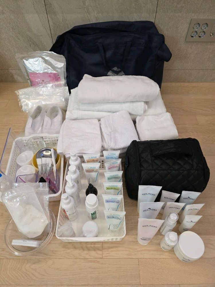 피부미용 실기 재료 풀세트 판매합니다 구성품으로는 화장품(에끌라두 제품) 크림팩 사용기한 - 정상 27.02.05/ 지성 27.04.14/ 건성 27.03.14 클렌징제품 사용기한 효소 27.08.15/ 아하 27.03.28/ 스크럽 27.03.10/ 고마쥐 27.06.23 기타제품 아이립크림 26.08.06/ 캐비어크림 27.03.10/수딩젤 27.06.11 매뉴얼테크닉 및 바디크림 27.02.05 화장품(아이위시 제품) 토너 27.08.01/ 클렌징로션 27.04.22/ 립아이리무버 26.10 대타올 3장 중타올 2장 소타올 15장 카트용 소타올 3장 바구니 2개 유리볼 플라스틱3, 유리 6, 유리 작은거 2 솜통 2개, 2과제용 1개 쟁반 1개 고무볼 1개 해면볼 1개 보관통 2개 붓5개 스파출라(팩용) 1개 스파출라 작은거 4개 눈썹칼, 가위, 쪽집게, 브러쉬 1개씩 터번 2개 모델 겉가운 속가운, 수험자 가운, 바지, 수험자 실내화(250mm)모델 실내화 스탑워치 물통 면봉통 손소독제 입니다.