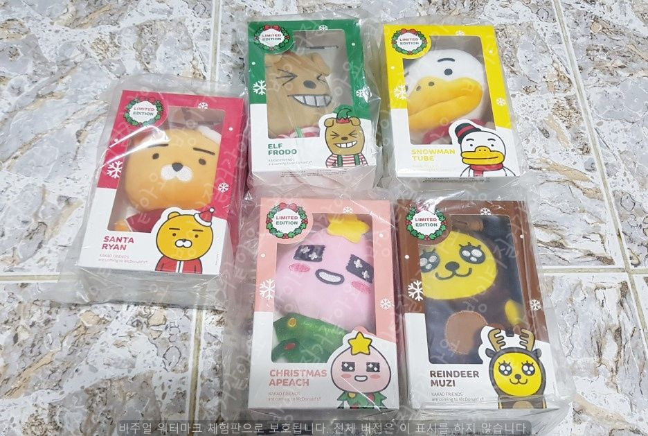 맥도날드 해피밀 2017 카카오프렌즈 크리스마스 인형 5종 세트 미개봉 ⊙산타 라이언 ⊙엘프 프로도 ⊙스노우맨 튜브 ⊙크리스마스 어피치 ⊙레인디어 무지 미개봉 배송비 포함 35,000원 채팅으로 연락주세요☺️