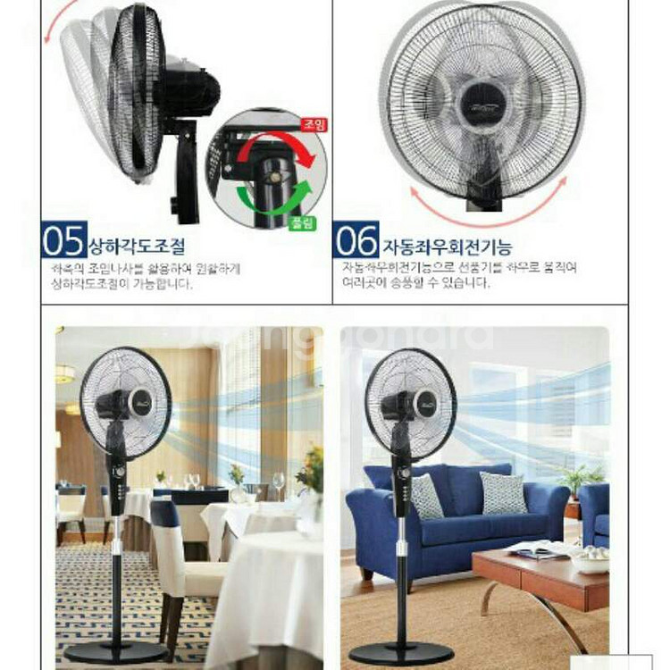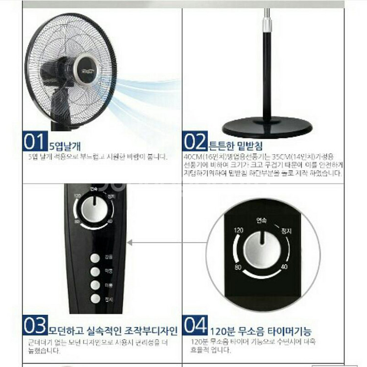 스탠드 대형선풍기 새제품 무료배송입니다. 고급스러운 모던 블랙컬러로 인테리어용으로 탁월합니다. 영업용이나 거실용으로 가장 많이 구매하는 16형 대형 스탠드 선풍기입니다. 저렴한 3엽날개가 아닌 5엽날개로 구성된 제품입니다. 강력한 55W모터가 장착되어있고 회전레버, 타이머(120분), 3단계 바람세기 기능이 있습니다. 깔끔한 블랙 색상입니다. 14형이 아닌 16형 대형이다 보니 밑받침 하단부분을 돌로 제작하여 튼튼하게 만들었습니다. 사이즈는 안전망 지름 45cm이고 높이는 (최저121cm~최대142cm)입니다. 수령시 불량일 경우 바로 교환 환불 가능합니다. 품질보증AS 구매 후 1년간 입니다. (동봉된 설명서에 AS연락처 있습니다.) 총판에서 판매하는거라 깔끔 포장 무료배송 해드립니다.