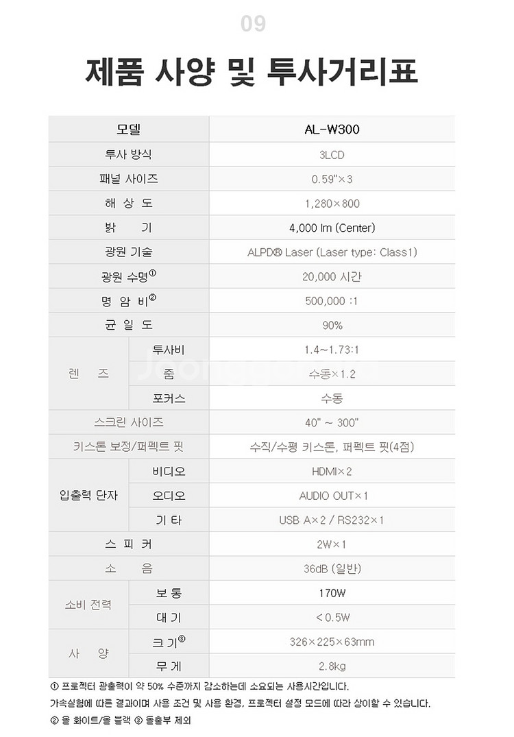 아포트로닉스 4000안시 WXGA 레이저 중고빔프로젝터 AL-W300 프로젝터 총 사용 10시간 미만 (정품풀박스) 직접 방문하시면 시연해보실 수 있으며, 전국 설치도 가능합니다 궁금하신 점은 부담없이 문의주세요 O1O-2OO4-7138 (화성 송산) 직거래, 택배, 퀵가능 가정, 업무, 교육, 이동, 업소, 매장용 4000안시 밝기와 WXGA해상도로 가정, 업무, 교육용, 업소 매장등에서 사용하기 좋은제품입니다 기본 레이저 광원 수명이 2만 시간으로 사용 빈도가 많은 장소에서도 램프교체의 번거로움이나 유지비 걱정없이 사용 가능합니다 [AL-W300제품사양] 4000안시/ 3LCD/ WXGA(1280×800)/ 500,000:1명암비/ HDMI×2/ USB×2/ 레이저 광원 (20,000시간 램프수명)/ USB뷰어/ 2W 내장스피커/ 4점 퍼팩트핏 키스톤 (제품사이즈: 326×225×63mm/ 2.8kg) 주원영상 빔프로젝터 / 16OO-5785 ■전 브랜드 신품 및 중고 빔프로젝터 판매 (가정,업무,교육,업소,매장,스크린골프,강당, 홀,이벤트,행사,전시,공연장,야외,극장용) ■각종 스크린, 케이블, 리모컨, 브라켓, 부자재, 옵션렌즈 ■프로젝터, 스크린, 음향기기 전국 설치 가능/ 엣지블렌딩 (신규 및 이전설치) ■전 브랜드 프로젝터 램프, 정밀크리닝, 유지보수,고장수리, 각종AS