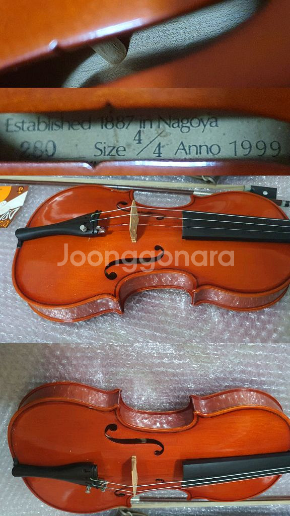 1. 스즈키 바이올린 넘버280 4/4 1999년산입니다. 붉은 레드빛 색상의 목재가 이쁜 모델입니다. 2. 국내수입되어 판매되는 스즈키 바이올린 sv-240이 80만원대, sv-320이 120만원대이므로 100만원 정도 유추됩니다. 오랜 세월 잘 건조된 모던바이올린인 점도 감안하시면 될거같습니다. 3. 사운드포스트 장착되어 있습니다. 바니쉬 등 외관 또한 갈라짐 크랙 등 하자 없으며 경미한 생활기스 정도 있습니다. 자세하게 다각도로 찍어두었으니 확인해주세요. 사진처럼 양호합니다. 4. 모던에 준하므로 하드케이스와 활은 세월감이 많습니다. 스트링 세트(Made in Austria)도 있으며 스트링은 녹은 안보입니다.(활과 스트링은 보급형이 여분 있어 희망시 추가 동봉 해드립니다.) 어깨받침대 Kun 4/4 (Made in Canada ) 상태 양호합니다. 수리흔적은 보이지 않습니다. 5. 장기간 사용되지 않고 보관되어 왔습니다. 바이올린 본체의 큰 하자(터짐,크랙 등)은 환불가능하오나, 그 외 스트링 교체, 브릿지 교체 등의 부속품 교체 및 재세팅은 당연히 필요할 수 있습니다. 6. 직거래 영주시. 중고악기입니다. 반품 불가 상품이므로 민감하신 분은 이유불문 무조건 직거래 바랍니다. 7. 택배시, 스티로폼 뽁뽁이 에어쿠션 등 완충재로 탄탄하게 방탄포장합니다. 포장경력 다수. 정말 만약에라도 파손도착시 환불 가능합니다. 수령일 당일 반드시 확인 바랍니다. 8. 완충재 안전포장비 + 선불택배비 등 모두 포함된 가격입니다. 9. 바이올린 상태를 동영상과 사진, 설명글로 자세하게 고지하였으며, 안전포장 및 파손보증 있으며, 안전결제도 가능합니다. 이에 거래 전 후로 지저분하고 비상식적인 분은 사양합니다. 10. 거래 직전 상품 상태와 포장 등 출고과정이 세세하게 녹화되기에 당일 출고가 힘들 수 있습니다.
