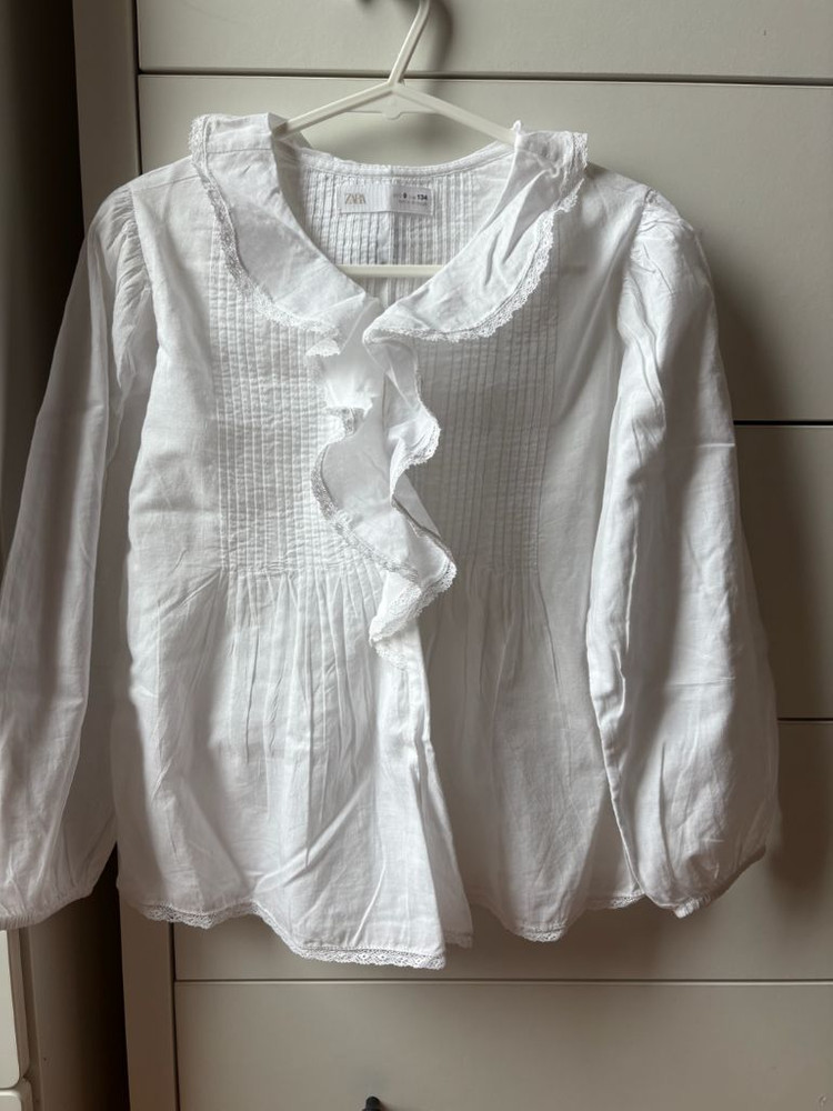 자라 흰색 블라우스 새상품입니다 레이스 트리밍이 예뻐요 - 브랜드: ZARA - 사이즈: 9-10세 (134cm) - 색상: 흰색 - 소재: 면 100% - 긴소매, 넥라인 러플 디테일 옷장보관해서 구김이 있네요 택만뗀 새상품입니다 택배가능 cu끼택 +2000원 일반택배 +3200원