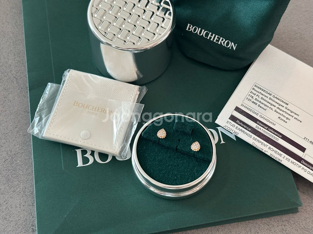 부쉐론 쎄뻥 보헴 귀걸이 판매해요 :) 사이즈 xs 색상 로즈골드 입니다~ 저는 2차 구매자로 25년 4월 새상품으로 구매했어요~(원 구매자 24년 12월 구매) 데일리가 아니라 착용하다 안하다 해서 사용감은 거의 없어요 :) 현재 매장가격 600만원이 넘어가는 제품이에요~ 저렴하게 좋은 상품 데려가세요 :) 신세계 강남에서 구매한 제품이고 보증서, 인보이스도 있습니다. 본품, 케이스, 파우치, 휴대용케이스, 보증서, 인보이스, 쇼핑백 구성입니다. 직거래는 인천 송도에서 가능합니다! 문자연락이 빠릅니다! 010,ㅅㅏ공사육,공ㅅㅏ팔사 편하게 연락주세요 :)