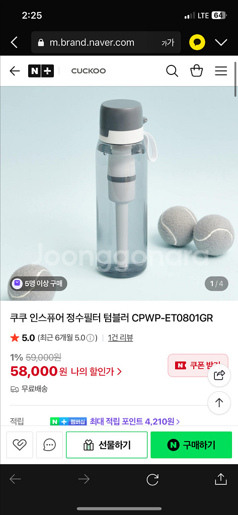 쿠쿠 인스퓨어 정수필터 텀블러 입니다. 사진 촬영만하고 사용하지 않은 새상품입니다. 본체 + 필터 2개 입니다. 사진 촬영을 위해 필터 한 개는 결합해 두었습니다. 정가 5.8만원입니다.! 반값 택포 3.5만원 입니다!