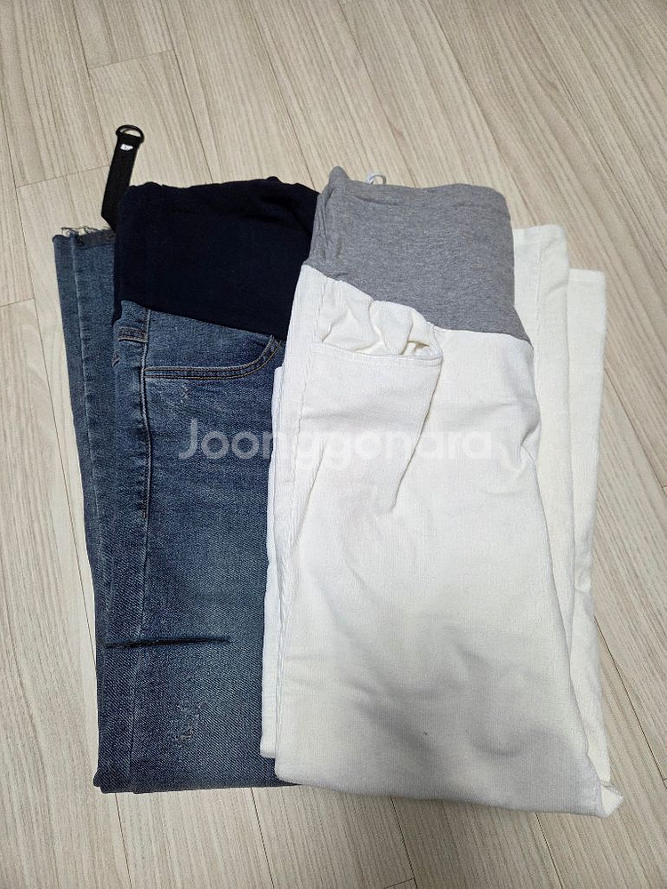 임부복 바지 라지사이즈 데님은 착용했고 하얀 건 코듀로이인데 안입었어요. 반값택배 가능 마지막 검정데님은 같이드릴게요 배 부위 옆이 튿어졌는데 입는데 문제없어요.