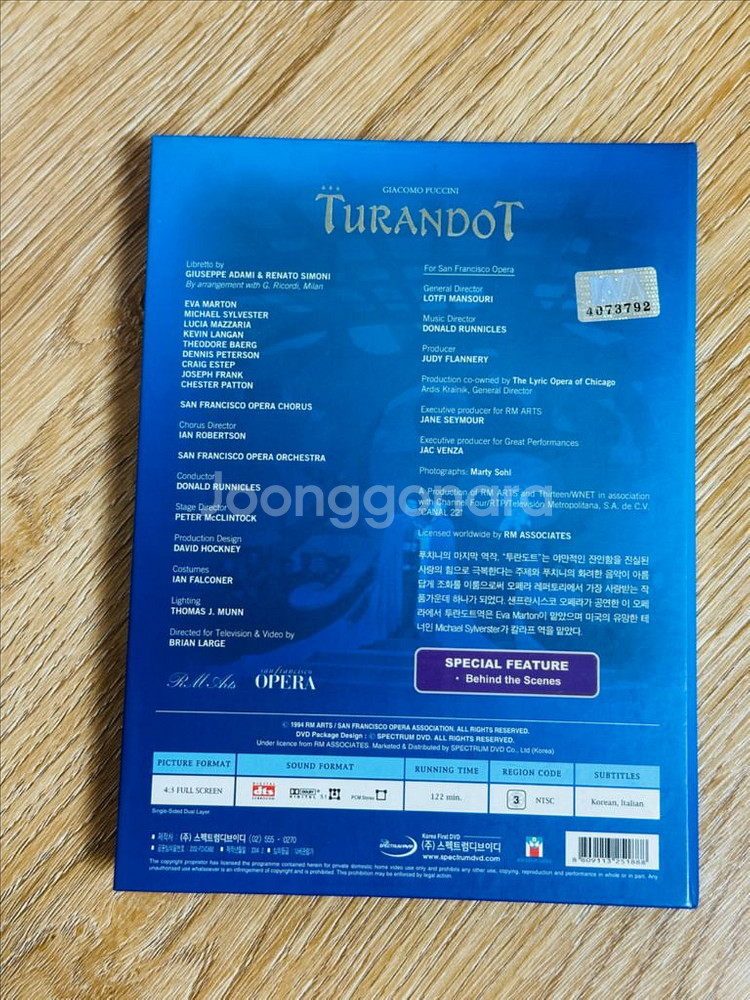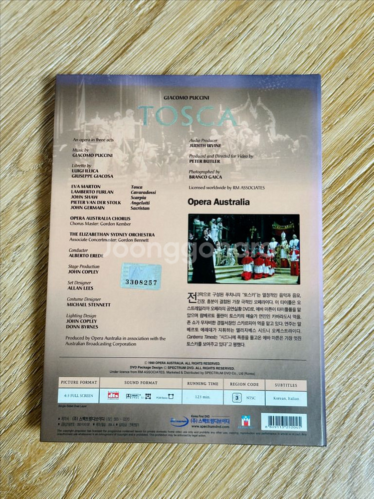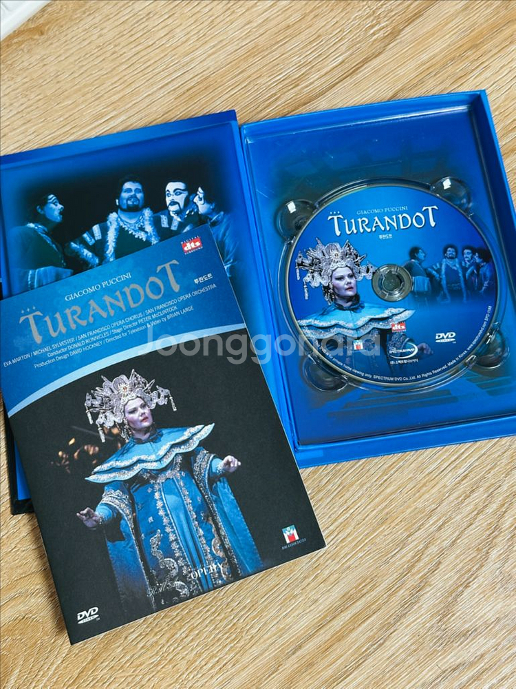 푸치니 명작 오페라 공연실황 DVD 3종 일괄판매 투란도트 + 토스카 + 나비부인 *투란도트 : 국내정식발매판, 샌프란시스코 오페라단, 1994년, Eva Marton출연, 122분, 지역코드3, 자막(한국어, 이탈리아어) *토스카 : 국내정식발매판, 오페라 오스트레일리아, 1996년, Eva Marton출연, 123분, 지역코드3, 자막(한국어, 이탈리아어) *나비부인 : 수입품, 비엔나 필하모닉 오케스트라, 비엔나 국립 오페라 합창단, 1974년, 카라얀 지휘, 미렐라 프레니 출연, 145분, 지역코드0, 자막(한국어 이탈리아어, 영어 독일어 프랑스어 스페인어 중국어) 너무나 유명한 클래식 명작인 푸치니의 오페라 공연실황 DVD 3종 입니다 현재는 단종되어 구하기 어려운 제품입니다 보존상태 훌륭하기 때문에 클래식/오페라 애호가 또는 수집가 분들께 좋은 소장품이 될 것입니다 3종일괄판매