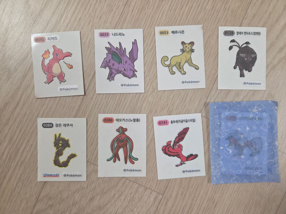다양한 포켓몬 스티커들이 있습니다~ 여러개 사시면 할인 해드립니다! 0005 리자드 *1,000원 0033 니드리노 *1,000원 0053 페르시온 *1,000원 0128 팔데아 켄타로스(컴뱃종) *2,500원 0384 검은 레쿠쟈 *42,000원 0386 테오키스(노말폼) *8,000원 0741 춤추새(이글이글스타일) *2,500원 0745 루가루암(황혼의모습)_미개봉 *2,500원