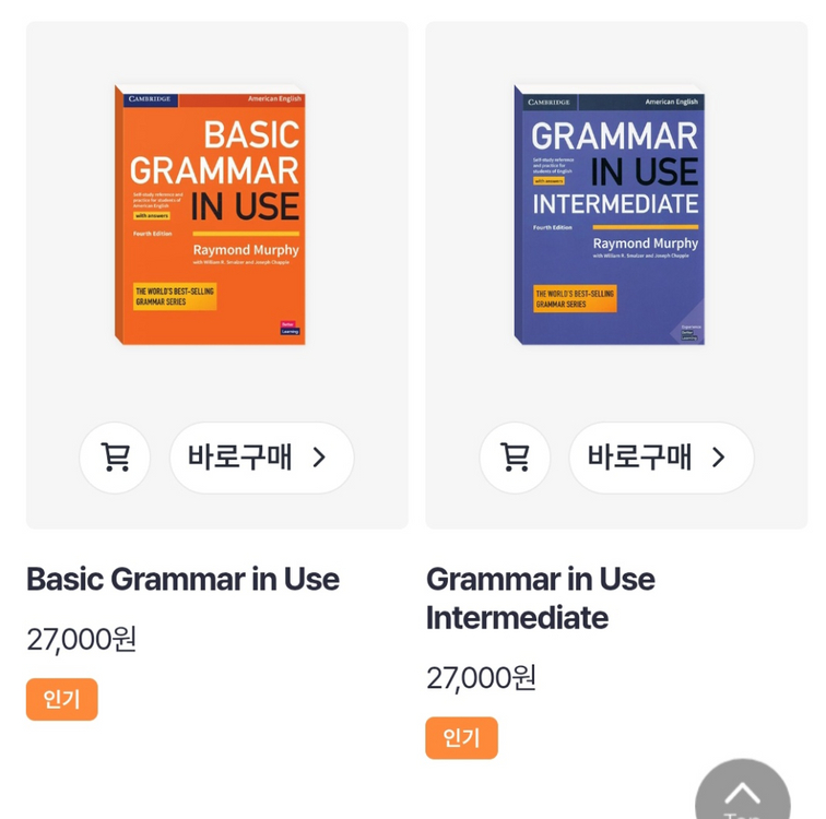 1. Basic Grammar in Use ㄴ 정가 2.7만 -> 판매 2.2만 2. Grammer in Use intermediate ㄴ 정가 2.7만 -> 판매 2.2만 3. 영어 에세이 훈련 에세이 라이팅 : 40일간 매일 훈련의 기적 ㄴ 정가 2.6만 -> 판매 2.1만 4. 통문장 암기학습 english 900 2권(프리토킹) + 3권(영어회화) / 1+2, 2+3, 1+3 다 가능 ㄴ 정가 2.6만(1.3만 2권) -> 판매 2.1만 5. 시나공 오픽 베이직 + 사람인 오픽 문장 조합 딥변 공식 ㄴ 정가 2.78만(1.3만+1.48만) -> 판매 2.2만 새책입니다. 택배비 무료