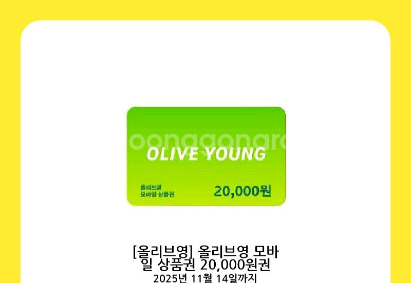 유효기한 : 2025. 11. 14 사실분만 채팅 주세요 ■ 사용안내 [올리브영 매장] 결제 시 모바일상품권 바코드 제시 (몰, 백화점, KTX 역사 등 일부 입점 매장 및 셀프계산대 이용 시 사용 불가) [올리브영 온라인몰] 결제 > 모바일상품권 잔액 조회하기 > 모바일상품권 번호 입력 > 잔액확인 > 결제하기 -올리브영 모바일상품권은 전국 매장(일부 매장 제외) 및 모바일 APP에서 즉시 사용 가능합니다. (PC 제외) -매장에서는 1회 결제 시 여러 개의 모바일상품권 사용이 가능하며, 온라인몰에서는 1회 결제 시 한 개의 모바일상품권만 사용 가능합니다. -표기된 금액 내에서 여러 번 분할 사용 가능합니다. -모바일상품권 금액 초과 구매 시 타 결제수단과 복합결제 가능합니다. -CJ ONE 포인트 적립 및 현금영수증 발행 가능합니다.