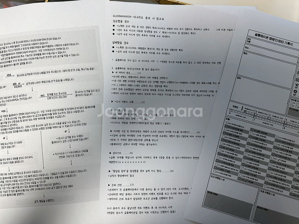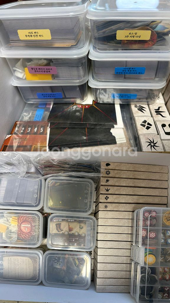 글룸헤이븐 보드게임 1회플 상품 리무버블 스티커와 함께 판매합니다. 작은 컴포넌트 한 개까지도 누락없이 모두 있습니다. 볼륨이 큰 보드게임이라 설명이 꽤 길 것 같습니다..^^ - 1회플은 초기 캐릭터 중 야만인, 주문직인, 무법자로 한 시나리오 해보아서, 그 외 구성물은 건들지 않았습니다. - 글룸헤이븐 오거나이저가 비싸서 다이소에서 산 통들에 라벨스티커를 붙여 컴포넌츠들을 정리했습니다. 참고 바랍니다. - [7번 사진] 야만인, 주문직인의 1레벨 카드와 캐릭터 토큰은 7번 사진에 보시는 것 처럼 지퍼팩에 담아서 각각의 캐릭터 카드 상자에 함께 넣어두었습니다. - [8번 사진] 리무버블 스티커는 1번째 시나리오에 필요했던 것들만 사용해서 붙였습니다. 당연히 떼어서 재활용 가능합니다. 빨간 동그라미로 지도에 붙여둔 곳 표시해두었습니다(2개). - [9번 사진] 보드게임 커뮤니티에서 몬스터 행동 판단기, 시나리오 종료 후 확인해야 할 것, 캠페인 추적기 자료를 받아서 인쇄했었습니다. 필요하시면 같이 드리겠습니다.(글룸헤이븐 게임 내에 없는 자료이고 제가 따로 찾은 자료입니다.) - [10번 사진] 차곡차곡 다 넣어도 들뜸없이 상자가 꼭 잘 닫힙니다. 애정을 담아 정리하고 1회플도 정말 재밌게 했는데.. 이제 같이 할 사람이 없어져서 보내줍니다.... 감사합니다.