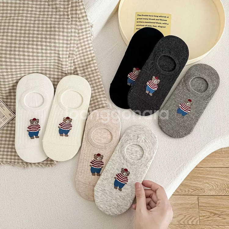 귀여운 곰돌이 캐릭터가 그려진 여성 덧신 양말입니다. 색상은 블랙, 화이트, 회색, 베이지 등 다양하게 준비되어 있습니다. 포장도 뜯지 않은 새 상품이니 선물용으로도 좋아요. 문의 없으시면 바로 안전결제해주시면 됩니다!