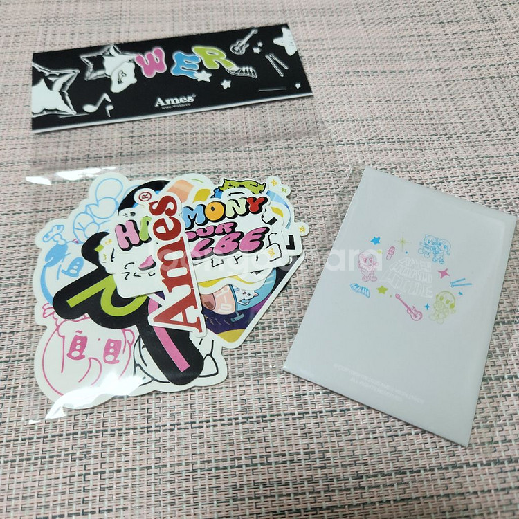 QWER 아메스 구매특전 포카와 스티커팩 + 키링 세트로 판매합니다. 미개봉 새 제품이며, 10만원 이상 구매 선착순 한정 특전이라 구하기 어려움 품목입니다. 별도 구매는 불가하며 택배비 별도입니다.