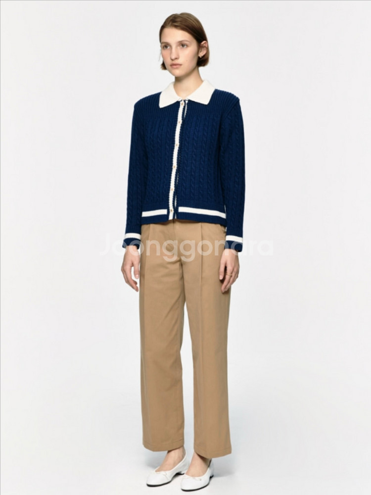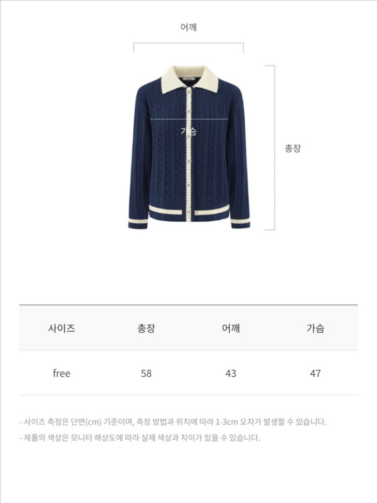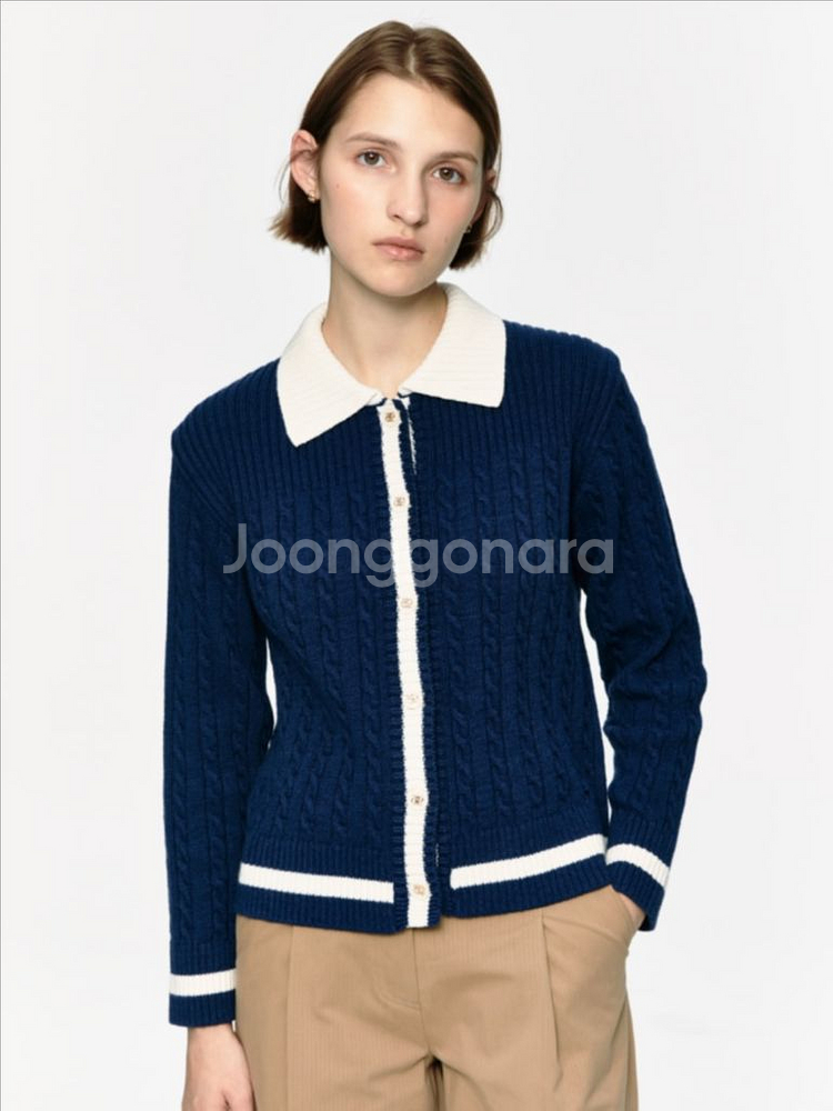 네이비 free 택 부착된 새상품 (정가 198,000) 고급스러운 컬러믹스 케이블 가디건입니다 드파운드 로고 버튼 포인트 밑단과 손목단 전체 스판사를 넣어 늘어짐없이 오래 입으실 수 있어요