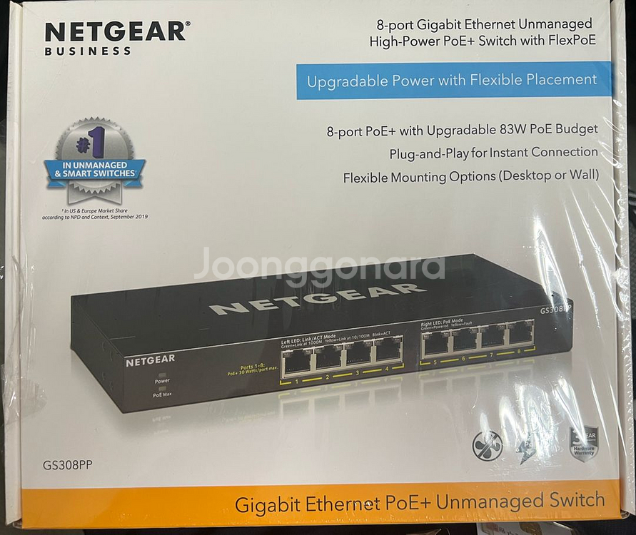 넷기어 비즈니스 GS308PP 스위칭 허브 미개봉 새제품 - 8포트 기가비트 이더넷 지원 - 업그레이드 가능한 고전력 PoE+ 스위치 - 최대 83W PoE로 다양한 장치에 전원 공급 가능 - 플러그 앤 플레이 방식으로 즉시 연결 가능 - 데스크탑 또는 벽면 설치 옵션 제공 소규모 사무실 및 가정에서 사용하기 적합하며, 팬리스 디자인으로 소음이 적음 * 찔러보기 사절