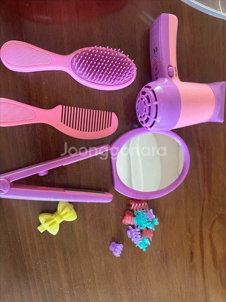 어린이 미용놀이 장난감 세트입니다 핑크색 빗, 거울, 헤어드라이기, 머리핀 등이 포함되어 있습니다 드라이는 작동하는데 건전지 접지 한쪽이 녹이나서 건전지 넣을때 뻑뻑하기는 한데 쓰는데는 문제없습니다
