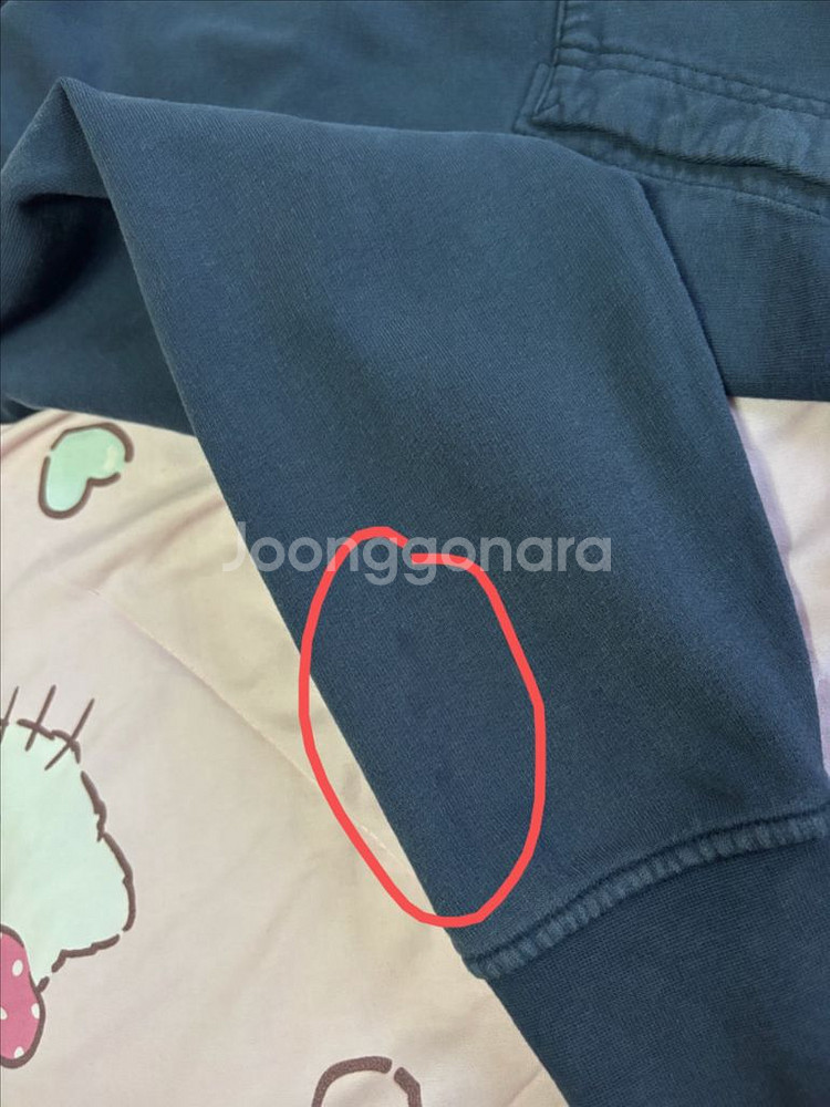 네이비색상 (물빠진거 아니고 원래 저래요) 정품 입니다 별로 못입었고 전체적으로 깨끗하고 늘어짐없어요 하지만 아이가 입었던거라 왼쪽소매 아래부분에 얼룩이 있습니다 조명이 밝아서 그렇지 티는 잘 안나요 남녀공용