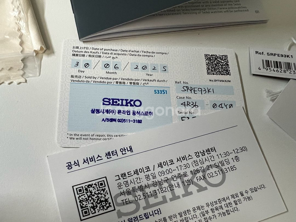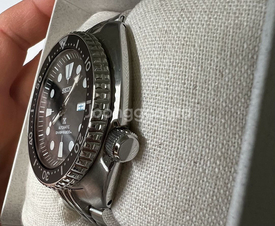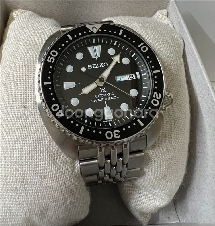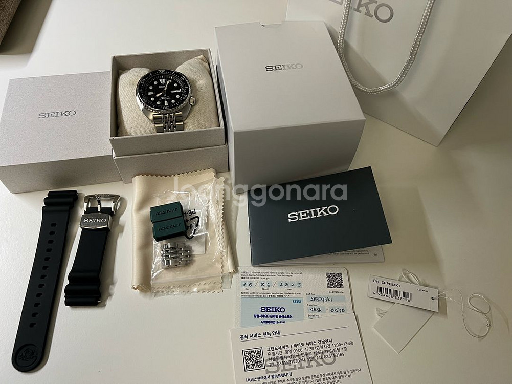 srpe93k1 세이코 터틀 팝니다. 한자창 나오는 삼정시계 온라인 정식 구매품 입니다. (스탬핑 25.6.30) 실착 5회미만으로 새상품급인 제품입니다. 문제없는 양품으로 기능 전부 이상 없습니다. 재치 러버줄은 한번 착용하고 보관했습니다. 터틀전용 스트랩코드 밀탯 쌀알 브레이슬릿 17만4천원에 구매해서 교체했습니다. 구매내역 사진 참고바랍니다. 풀박스 구성품 그대로 있고 브슬 여분줄도 있습니다. 추가로 5만원이상주고 구입한 22mm 퀵릴리즈 빈티지 소가죽 스트랩도 같이드립니다. 두께가 있어서 터틀하고 잘어울리는 가죽스트랩입니다. 네고x 택포 60만. 안동 직거래 가능. 택배거래시 매우 안전하게 포장해서 보내드려요. 거래내역 많습니다. 연락주세요 :)