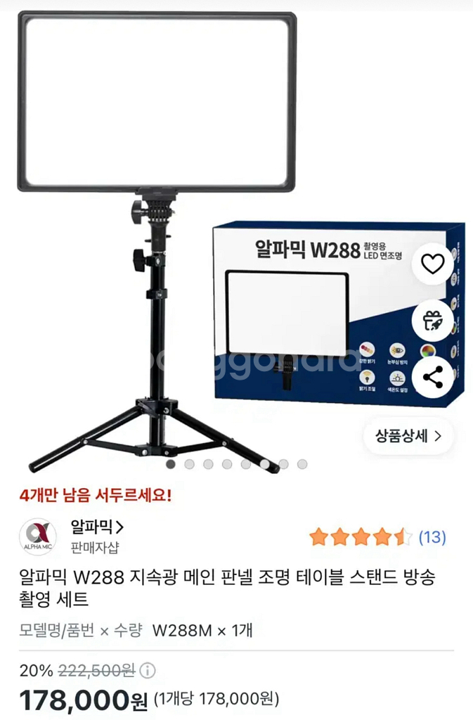 미사용 새상품입니다 알파믹 W288 촬영용 조명 새상품입니다. 스튜디오나 집에서 촬영할 때 유용하게 쓰일 조명입니다. 빛이 부드럽게 잘 나와서 사진 퀄리티를 높여줍니다 개인방송,크리에이터필수제품!