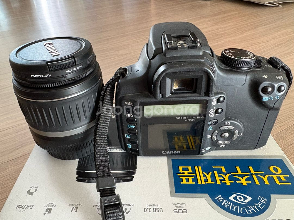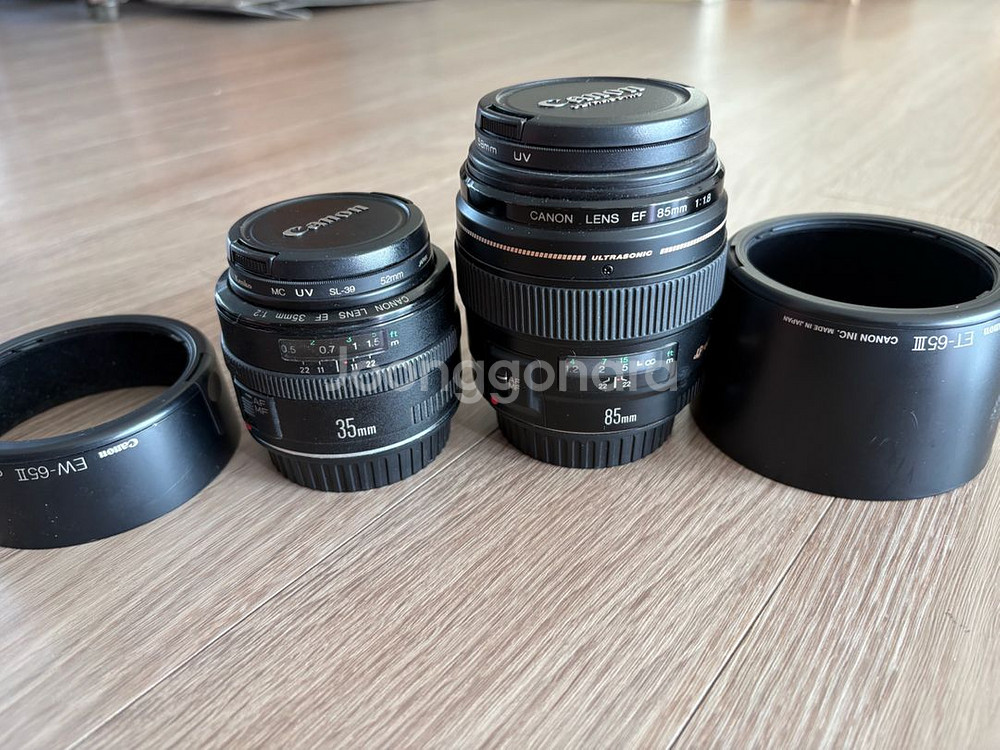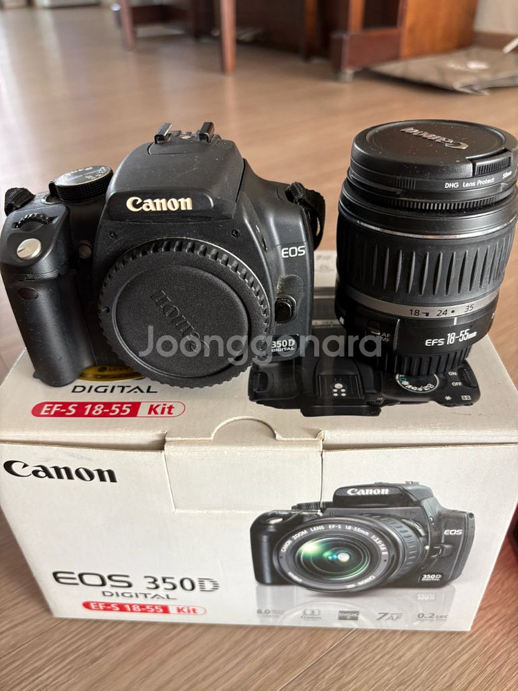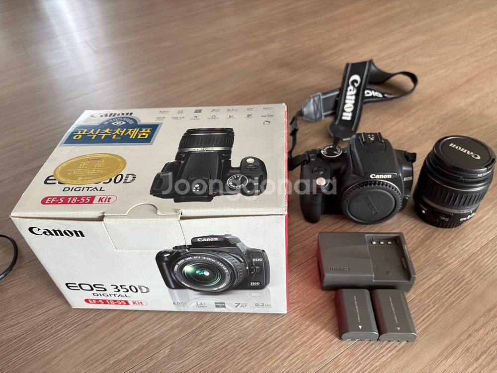 캐논 EOS 350D 디지털 카메라와 EF-S 18-55mm 렌즈 키트입니다 박스, 카메라 본체, 렌즈, 배터리, 충전기, 스트랩 등 사진에 보이는 모든 구성품 함께 드립니다 추가로 85mm 1.8은 20만, 35mm f2는 14만에 개별 판매합니다.
