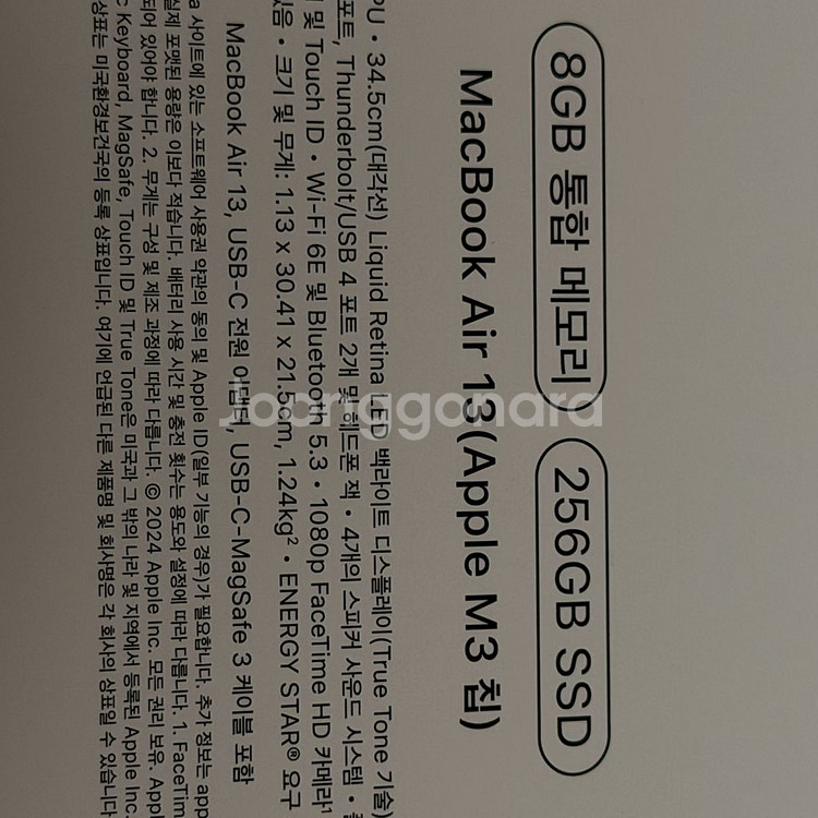 애플 맥북 에어 13인치 M3 칩 모델 판매합니다 집에 모셔두다싶이해서 흠집 하나없이 깨끗합니다 배터리 사이클도 30으로 좋음 - 8GB 메모리 - 256GB SSD - 풀박스, 충전기 포함 - 2024년 8월 구매함