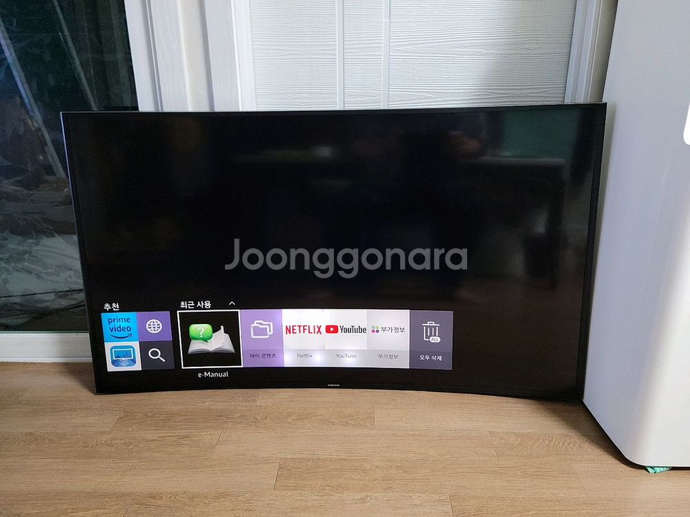 삼성 커브드 55인치 UHD(4K) SMART TV 입니다(하자있음/내용필독후 신중한 구매 바랍니다/구매후 반품불가) 벽걸이용으로 사용했었습니다 외관 전체적으로 깔끔하고 UHD(4K) SMART TV 답게 화질 좋습니다 랜선연결해서 유튜브/넷플릭스 등 시청 가능합니다 흔치않은 Curved(곡선형)이라서 시청 몰입감 좋습니다 다만 한가지 하자가 있습니다 사진 잘보시면 흰점들이 보일겁니다 아마도 백라이트 확산렌즈가 떨어져서 그런것 같습니다 (움직이면 덜그럭거리는 소리가 납니다) 백라이트 교체 및 수리가 필요할것 같습니다 리모컨 없습니다 호환리모컨은 다이소나 생활용품점에서 인터넷에서 1만원이내로 구입가능 합니다 흰반점이 보이는 화면도 있지만 어떤 화면은 괞찮은 화면도 있어서 신경안쓰고 보면 그럭저럭 볼만은 합니다 신경안쓰고 보실분이나 백라이트 수리가 가능하신 분이 가져가시면 좋을것 같습니다 사진에는 없지만 벽걸이 브라켓 있습니다 백라이트 불량문제/리모컨 앖음 등으로 부품값 정도로 가격올립니다 내용 잘 읽어보시고 신중한 구매 바랍니다