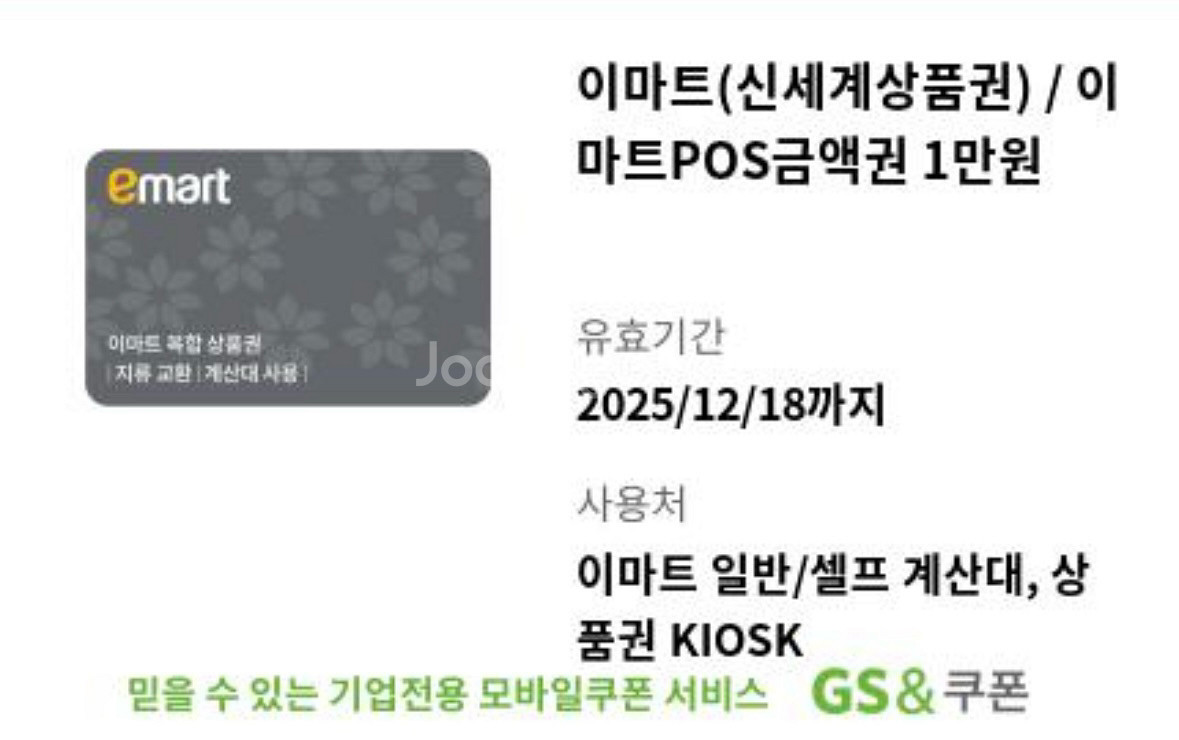 이마트 금액권 1만원권 x5장 유효기간, 유의사항 사진 참고해주세요 총 50000원 -> 47000원 판매합니다 상품권 거래 특성상 전송 후 환불 불가능합니다 - 이마트 KIOSK 사용처: 이마트 상품권 교환 KIOSK (백화점 교환 불가) - 이마트 POS 사용처: 이마트/트레이더스 전 지점, 노브랜드 직영점, 이마트에브리데이 직영점 (단 이마트 부천점, 안양점, 이마트24, 노브랜드/이마트에브리데이 일부 매장 제외)