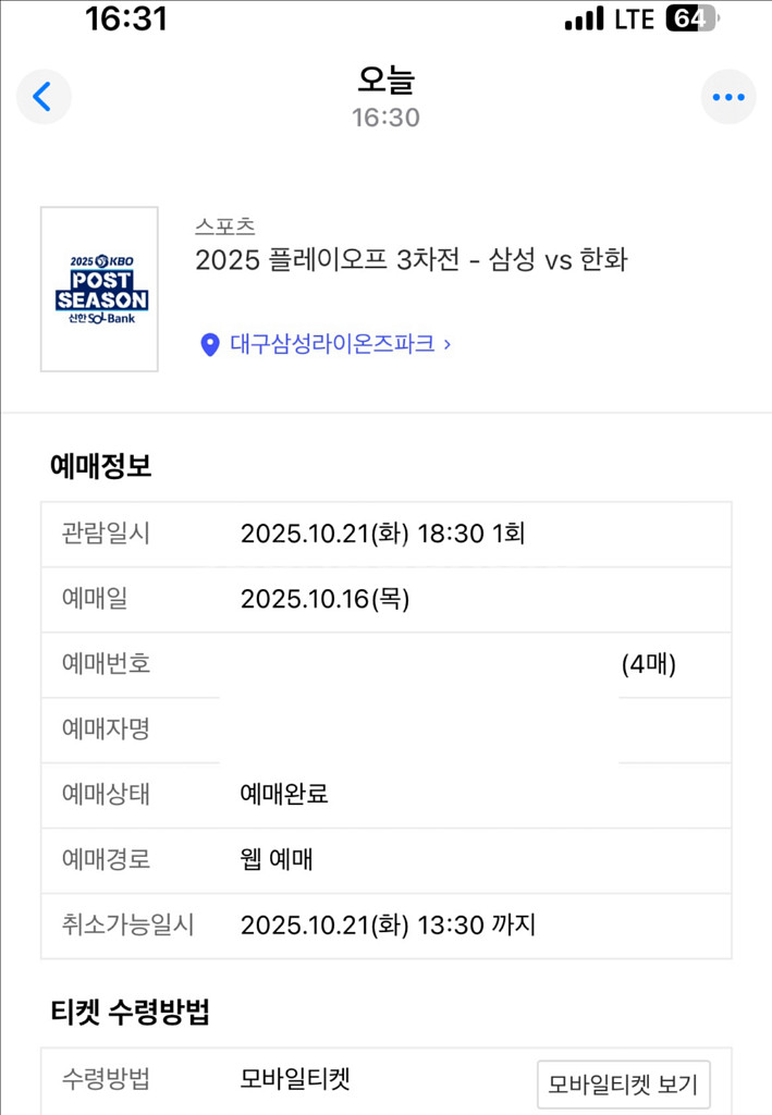 10월 21일 플레이오프 3차전 3루 스카이지정석 상단 입니다 좌석은 U-31구역 20~22열 사이 우통로(홈플레이트 방향) 2연석, 4연석 - 장당 7.5만원 티켓은 모바일티켓 선물하기로 보내드립니다. 이전 거래내역 많습니다 사기 걱정 노노입니다.