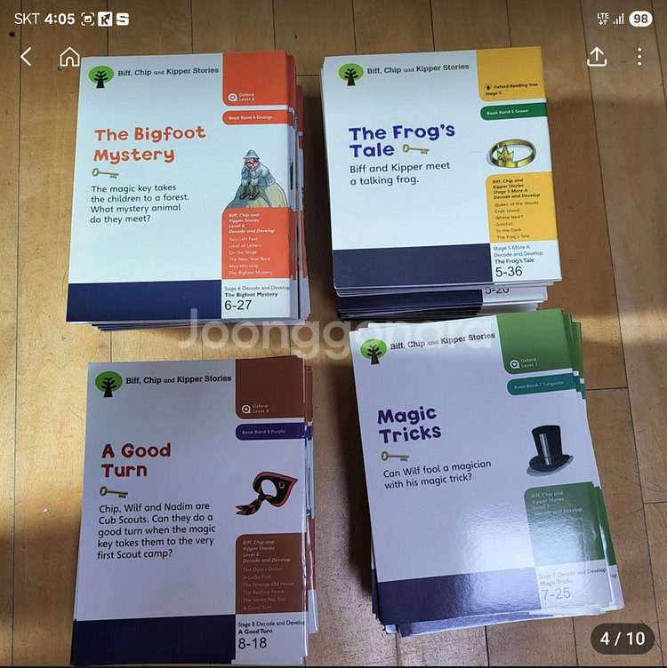 ORT 홍콩판 풀셋입니다 증간본 포함 전단계구성에 16G 곰돌이펜 2개 입니다 1단계 : 96권 (1 ~ 24권까지는 워드리스 입니다) 2단계 : 54권 3단계 : 42권 4단계 : 42권 5단계 : 36권 6단계 : 27권 7단계 : 25권 8단계 : 18권 9단계 : 18권 11 ~ 13단계 : 각 6권 (원래 10~12단계인데 11~13으로 표기되었다고 하네요) 워크북 8권 (사진에 보시면 1권 1장 줄긋기만 했어요) 딕셔너리 2권 (같은 책 2권입니다) 듣고 쓰는 워크북 1권 총 387권입니다 1단계 25권부터 50권 정도까지만 보고 안봤습니다 택배 착불 (권수가 많고, 부피를 많이 차지해서 택배비가 많이 나올 수 있습니다. 로젠택배 이용 / 정확한 금액을 몰라 10,000원으로 기재했습니다.) 구매자 요청 시 음원등 가지고 있는 자료는 메일로 보내드립니다 (미국음원, 영국음원, 워크북 PDF 파일, 매직키 1,2,3, 번역본 & 가이드북)