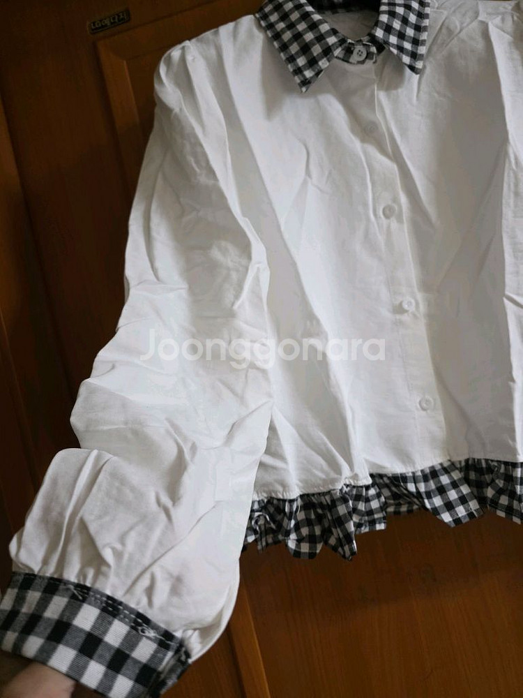가단 48cm 총장 54cm 새상품 프리사이즈 퍼프소매 목 카라와 소매끝단&하단 체크무늬의 셔츠 남방.. 스팀 한번 쐬어주심 더 예뻐요^^