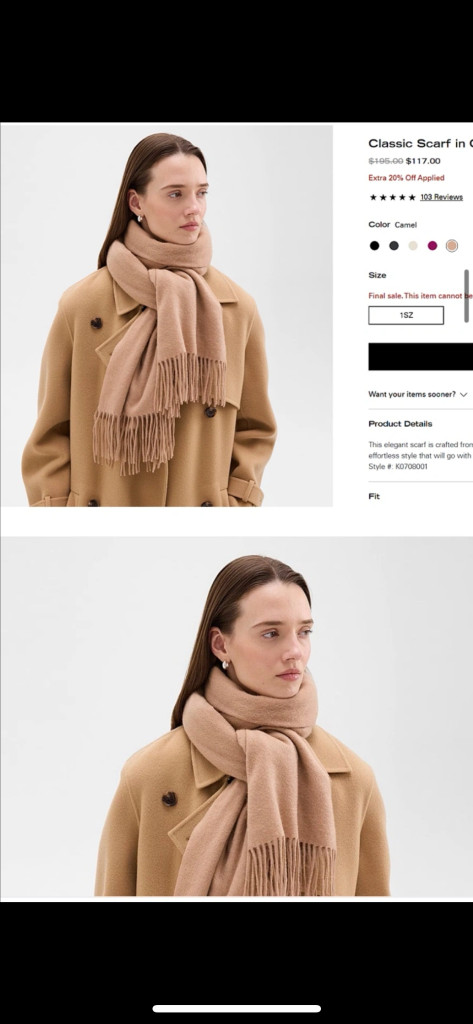 Theory 캐시미어 목도리 - 부드러운 캐시미어 소재로 피부에 닿는 느낌이 매우 좋습니다. - 카멜 색상으로 어떤 옷에도 잘 어울립니다. - 가볍고 따뜻해서 겨울철에 유용하게 사용할 수 있고, 펼치면 숄로 활용할 수 있습니다. 작년 SSF몰 39만원 구입 세탁을 안한 상태라 예민하신 분은 패스해주세요. 가격조절 문의는 사양합니다. 택배 3천원 추가