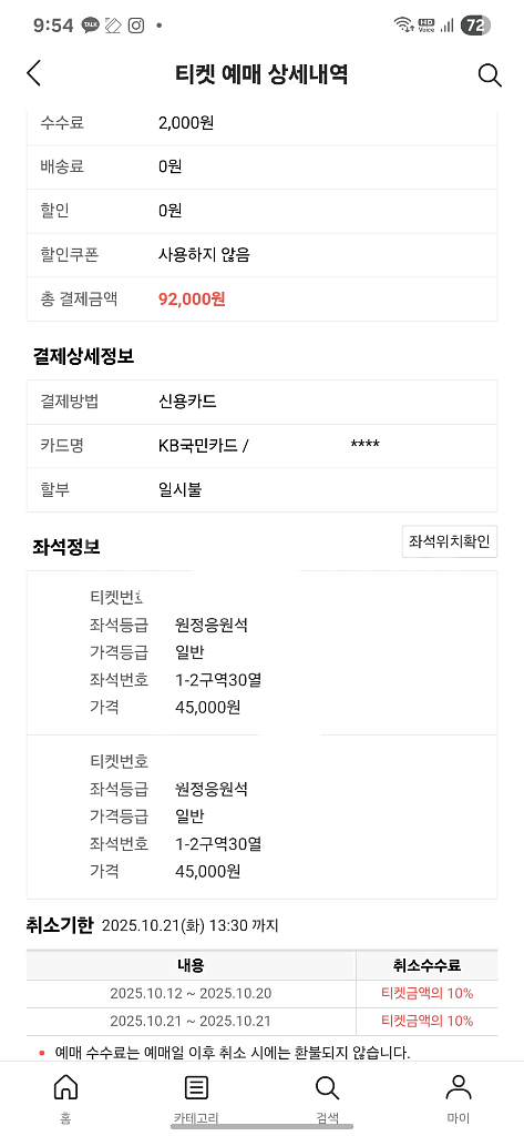10월 21일(화) 한화vs삼성 (PO 3차전) ⚾️원정응원석 1-2구역 30열 2연석(2자리 건너 통로 -> 장당 9.7 인터파크 티켓보내기로 드립니다 ⚾️우천'취소'로 인한 환불 외, 개인변심으로 인한 환불은 어렵습니다! 신중히 구매해주세요 (우천연기는 환불대상 아닙니다)⚾️ 🏛근무중엔 연락 느릴 수 있습니다 (오후8시까지)🏛 단순 찔러보기식 연락은 차단하겠습니다 거래내역 많으니 사기당할 걱정하지마시고 연락주세요!!