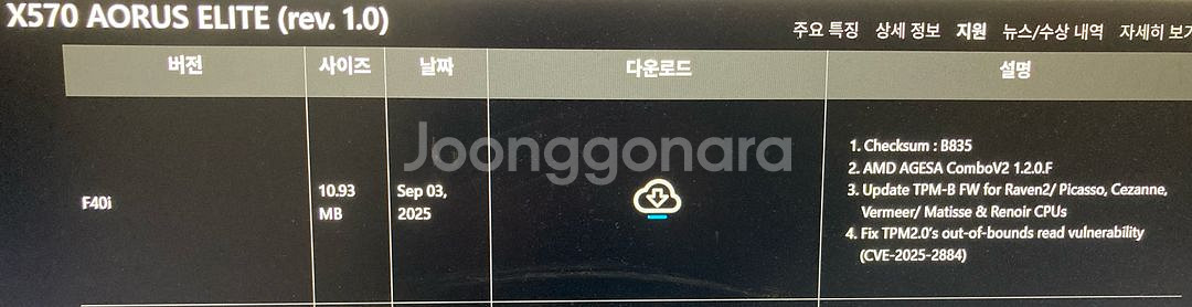 기가바이트 X570 AORUS ELITE 게이밍 메인보드입니다. 제품 박스부터 부속품 일체 포함 풀세트 필요할 때 한 번씩 사용한 제품이라 상태 좋습니다. - 최신 BIOS 업데이트 (2025, Sep, 03 / F40i) - M.2 나사 / M.2 스탠드오프 (보드 장착) - G 커넥터 한 개 - SATA 케이블 4개 (미개봉) - A/S 종료 - AMD 라이젠 3000 시리즈 데스크탑 프로세서 지원 - 12+2 디지털 전원부로 안정적인 전원 공급 - PCIe 4.0 지원으로 고성능 그래픽 카드와 SSD 사용 가능 경기 양평 직거래 택배 가능(착불 또는 5,000)