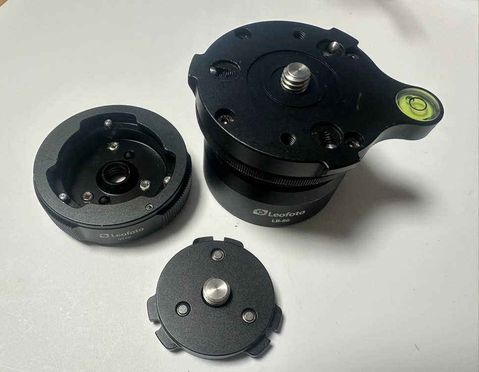 레오포토 LB-66 레벨링 베이스와 QS-60 퀵 링크 커넥팅 플레이트 세트입니다 보관상의 스크래치들 있습니다 카메라 파노라마 헤드로도 사용 가능합니다 일괄 판매합니다 택배 착불