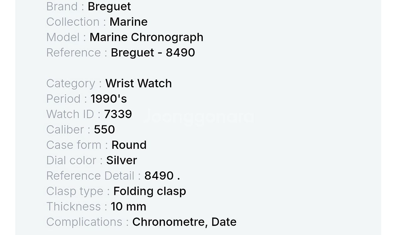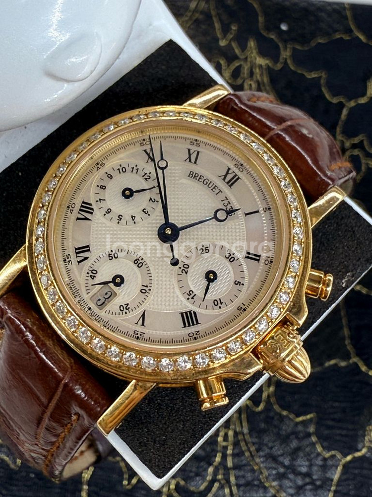 브레게 마린 크로노그래프 오토매틱 REF.8490 28mm 전체 18K 골드, 다이아몬드 셋팅 1990년대 모델. 마지막 사진은 같은 모델 브레게 설명입니다. 참고하시라 올려둡니다. 오래되어 보증서, 시계 케이스는 없습니다.